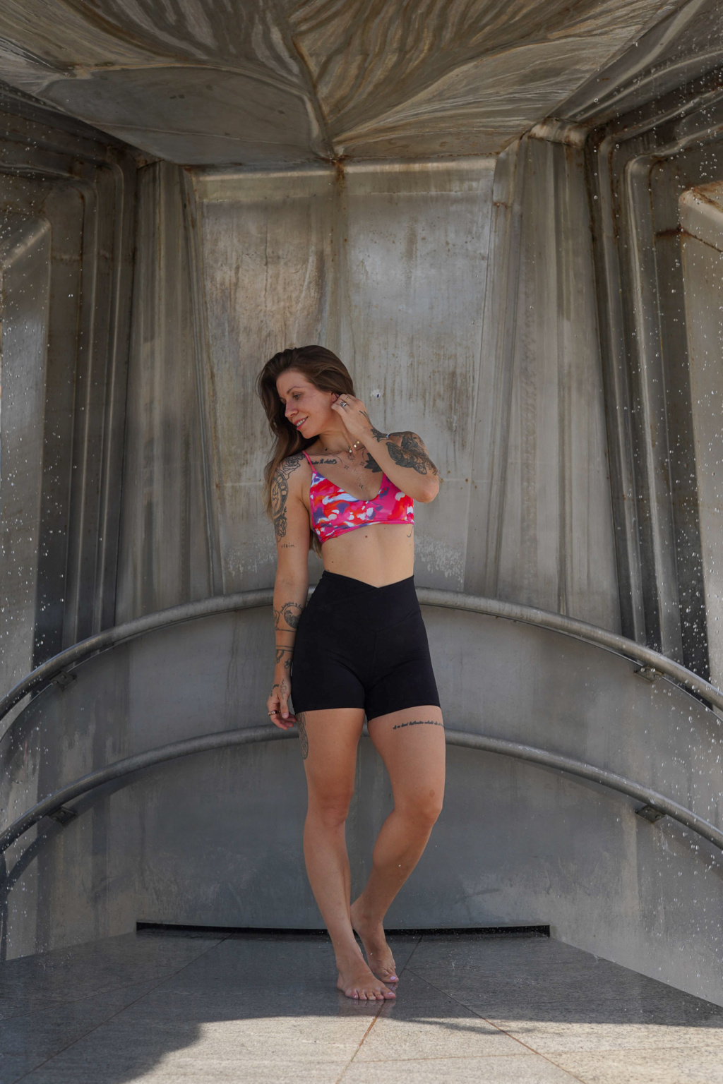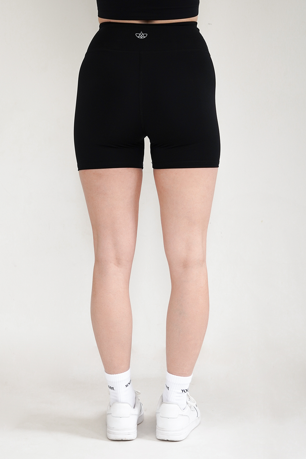 Prekrížený pás vpredu vytvára charakteristický tvar “V”, ktorý opticky zoštíhli pás, zvýrazní boky a podporí prirodzenú siluetu presýpacích hodín. Vyšší pás z dvojitej vrstvy materiálu drží šortky pevne na mieste aj pri dynamickom pohybe a zároveň poskytuje jemnú oporu brušku.